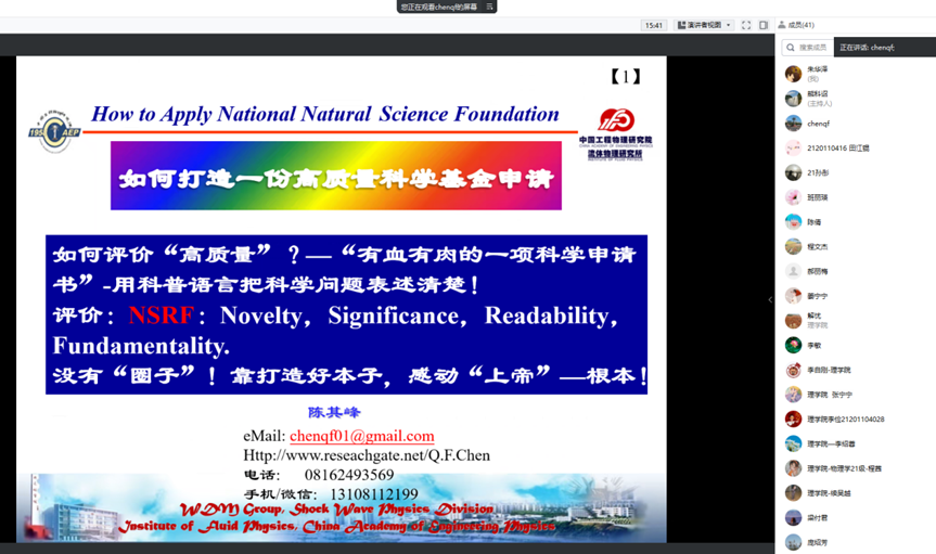 会上,陈其峰教授结合自己在国家自然科学基金申报过程中的经历和经验,作了“如何打造一份高质量科学基金申请书”的精彩报告。陈教授从如何打造一份有血有肉的高质量科学申请书入手,通过物理类案例讲解了如何提出问题、解决问题、凝练科学问题等一系列重要环节。报告深入浅出,对教师们在现阶段如何选定科学问题属性和申请代码等关键细节带来了很大启发。报告结束后,best365中国官方网站部分老师汇报了基金的进展情况,陈其峰教授就具体问题提出了建设性指导。
