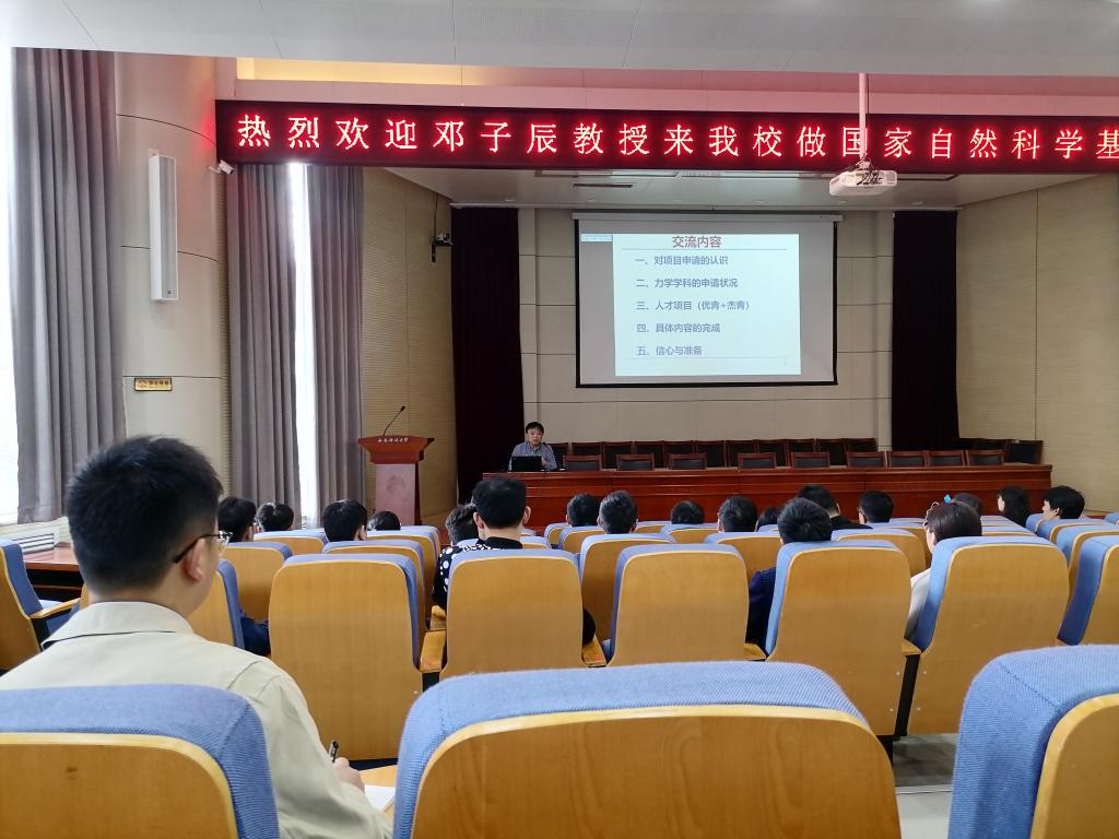 本次报告邀请了国家长江学者西北工业大学邓子辰教授做了题为《国家自然科学基金写作指导与经验分享》的主题讲座。邓教授结合自己丰富的申报和评审经验,从学科申报现状和形式分析、人才项目申请的特定以及具体申报数撰写的技巧和评阅要点等方面国家自然科学基金申请的各个环节。特别指出青年申请人应积极做好前期准备工作,准确把握基金的定位,充分了解项目指南,积累相关经验;在撰写申请书的过程中应紧扣科学问题,抓住问题本质,做到条目清晰、层次分明。邓教授在报告中用了8处“新”阐述了高质量申报的核心要义和关键科学问题凝练方法,具有很强的启发性。会后,对于青年教师申请书的具体问题举行了小范围有针对性地的座谈会.