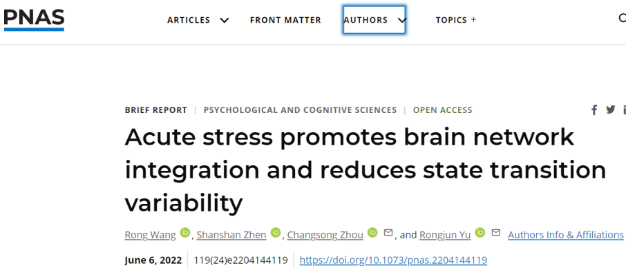 近日,best365中国官方网站王荣副教授课题组与香港浸会大学周昌松教授、余荣军教授,在社交压力形成机理研究方面取得突破性研究进展,研究成果以“Acute stress promotes brain network integration and reduces state transition variability”为题在美国科公司院刊PNAS,以report形式在线发表,best365中国官网为第一单位。
