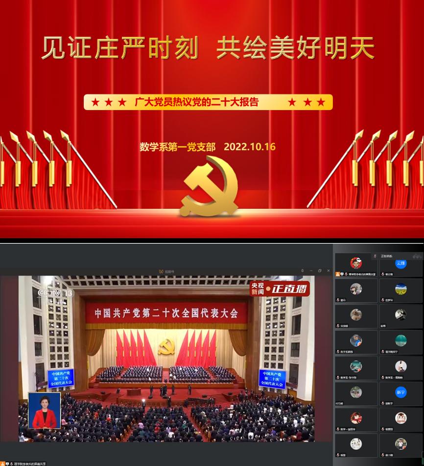 10月16日上午10时,举世瞩目的中国共产党第二十次全国代表大会在北京隆重开幕。best365中国官方网站数学系第一党支部全体党员聚集在腾讯会议屏幕前,怀着无比激动的心情共同收看了大会实况直播,喜迎盛会的胜利召开。