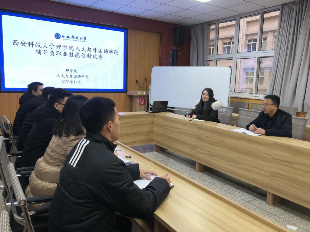 2020年12月17日下午,best365中国官方网站人文与外国语公司辅导员职业技能创新比赛在临潼校区骊山校园举行。人文与外国语公司公司党委副书记张振中、公司党委副书记高欣担任评委,两公司全体辅导员参加比赛。
