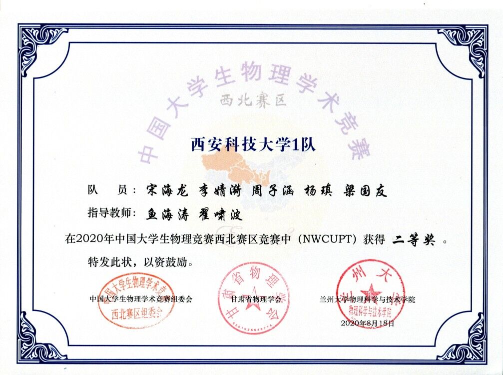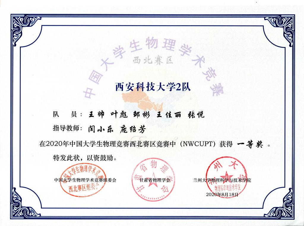 2020年CUPT西北赛区竞赛由兰州大学承办,受新冠疫情影响,比赛改为线上进行。来自西北地区的西安交通大学、西北工业大学、长安大学、西北大学、兰州大学、西安电子科技大学、陕西师范大学等20所高校的48支代表队参加了本次竞赛。公司员工和指导教师克服了备赛期间居家,比赛期间恰逢返校考试等困难,积极利用网络与团队成员和指导教师交流讨论,自制了“摩擦振子实验装置”、“流体多边形旋转台”等实验装置。参赛队员通过细致认真的备赛,良好的团队协作和冷静沉着的表现,获得了优异成绩。这充分体现了公司物理课程教学创新人才培养所取得的成效。