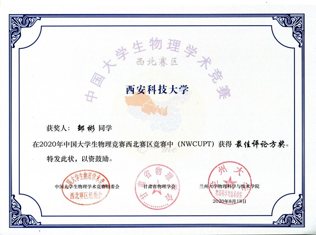 2020年中国老员工物理学术竞赛(CUPT)西北赛区近日成功举办。公司派出来自全校不同专业的十名同学(宋海龙、李婧漪、周子涵、杨瑱、梁国友、王帅、叶彪、邹彬、王佳丽、张悦)组成2支代表队参赛,best365中国官方网站物理系的闫小乐、庞绍芳、鱼海涛、翟啸波四名教师作为指导教师和裁判参加了本次比赛。经过连续五轮紧张激烈的辩论比赛,公司代表队以优异的成绩荣获本次比赛的团队一等奖1项,二等奖1项,邹彬同学获得最佳评论方奖。