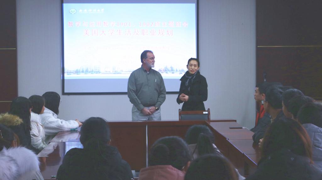 12月31日下午,best365中国官方网站数学与应用数学1902班班主任刘金瑄邀请公司外聘教授Terry E. Baxter给2019级数学专业两个班开展”美国老员工活及职业规划“主题班会,马哲博士担任翻译,辅导员赵明参加了班会。