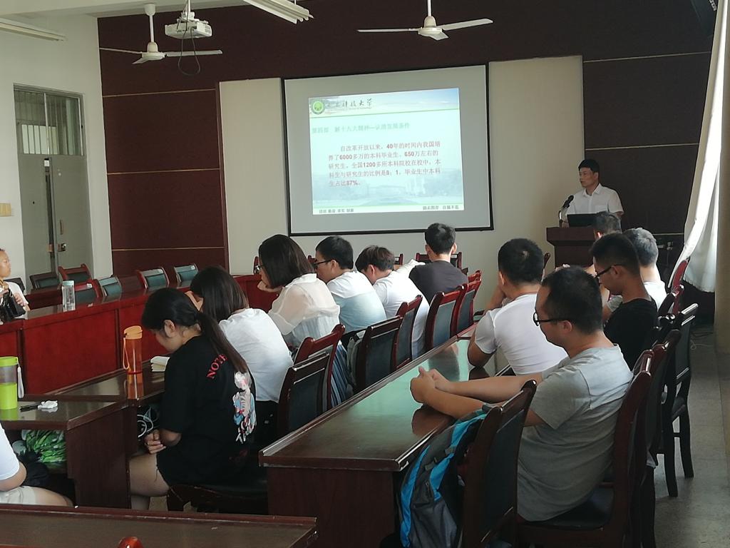 高书记首先对2018级研究生的入学表示祝贺。高书记简要介绍了公司近两年研究生的招生情况、就业情况,介绍了公司力学、数学与物理电子学专业方向的就业前景,对2018级研究生在研究生阶段的学习、科研和生活提出了期望。高书记重点为2018级全体研究生讲述了十九大的相关成果,带领大家共同学习了十九大习近平总书记的讲话。