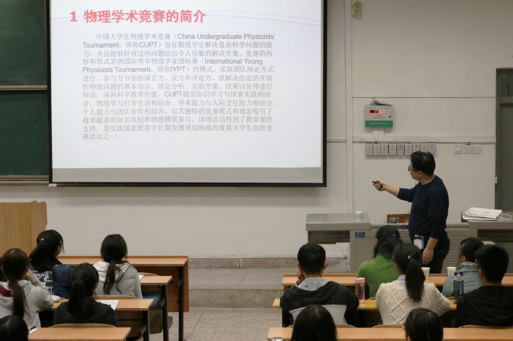 会议开始,闫小乐老师对关于此次竞赛的相关信息给同学们进行了普及。best365中国官网老员工物理学术竞赛以培养参赛者的创新意识、创新能力、协作精神和实践能力为根本理念,是一项以团队对抗为形式的物理竞赛。之后,闫老师又对竞赛规则进行介绍,并演示了答题范例。接下来,闫老师对每一道选题也做了引导性的解说,讲话生动而不失严谨,勾起了同学们对动手实验、探究问题的兴趣。