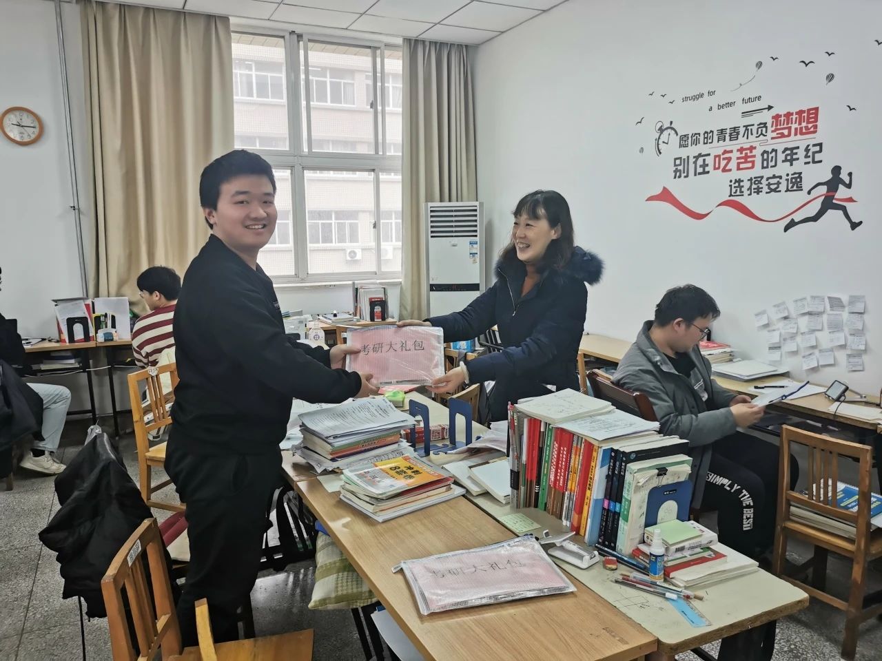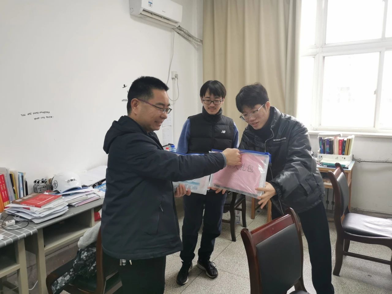 他们为在寒冷天气中备战考研的同学们发放 “考研大礼包”。老师们表示,考研的同学们复习非常辛苦,天气很冷,并且最近流感盛行,借这次送温暖的活动希望员工们不要有过多压力,放平心态,都能考出好成绩。