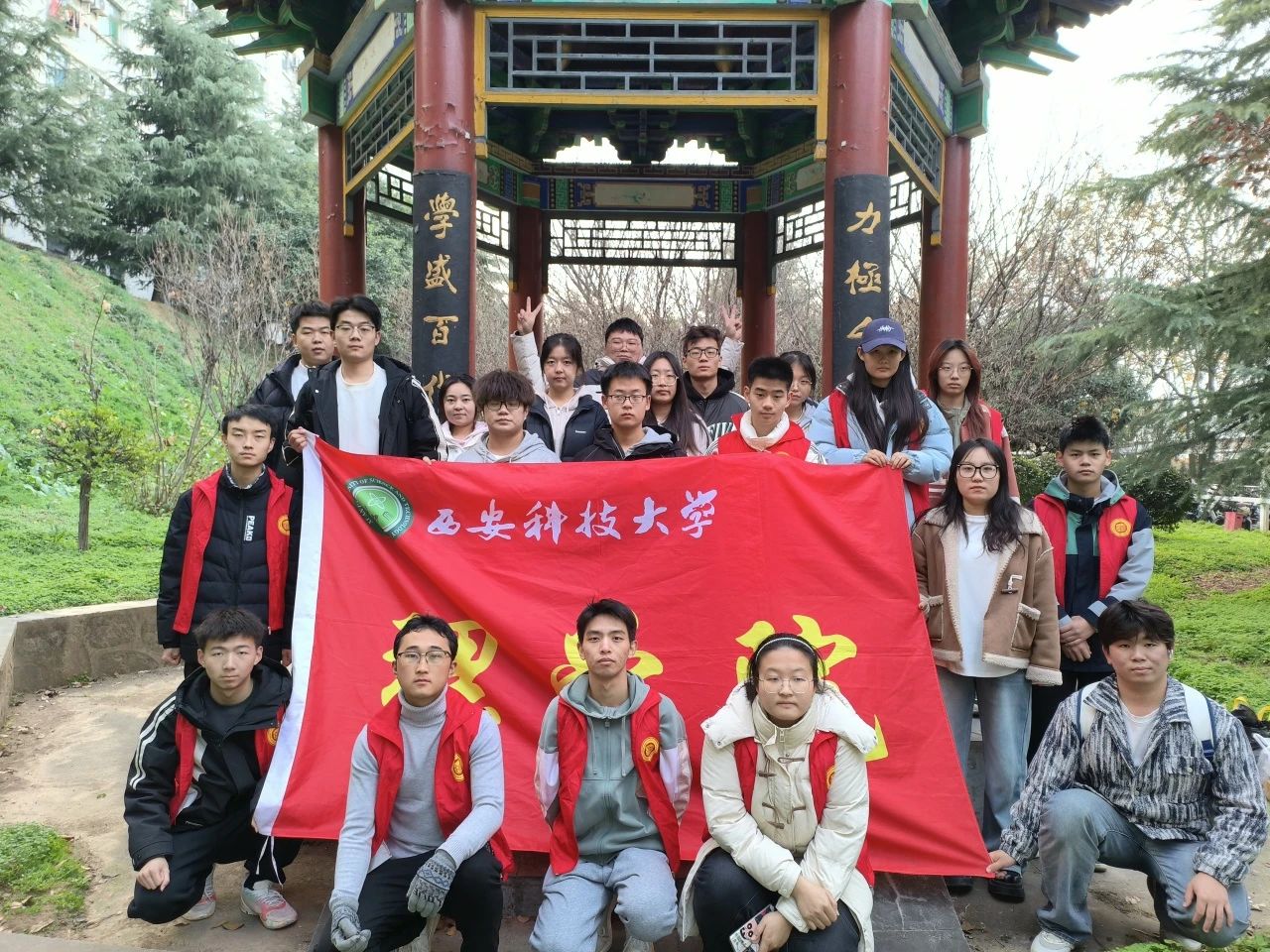 同学们共同参观了博知亭,浏览了77级力学员工的名字,瞻仰了写有“师魂”两个大字的纪念石,接着,他们手持垃圾袋,分组在博知亭周边仔细搜寻并捡拾垃圾。