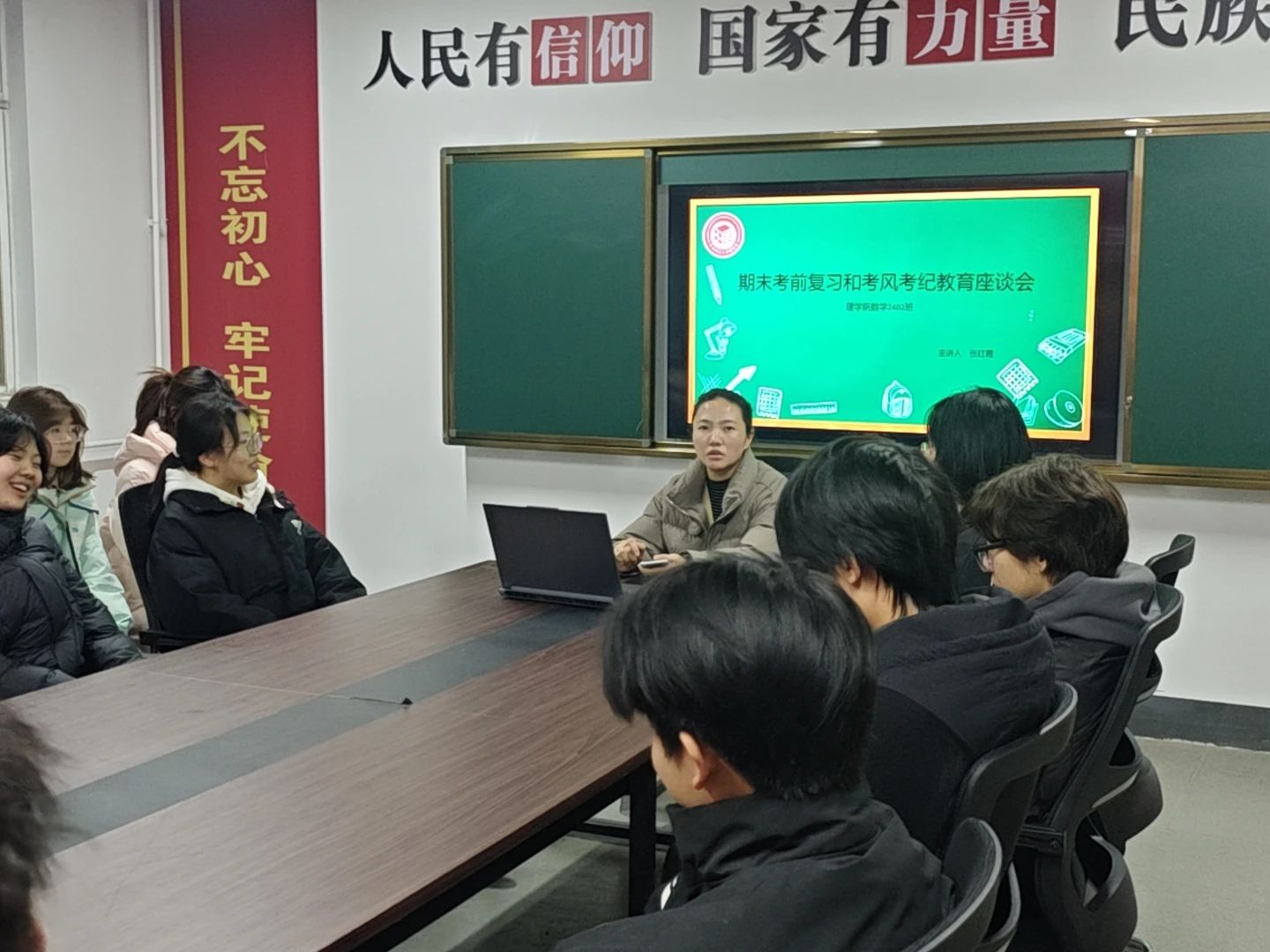 12月13日,best365中国官方网站于“一站式”员工社区举办了期末考前复习和考风考纪教育座谈会,本次座谈会由数学与应用数学2402班班主任张红霞主持,数学与应用数学2402班参加。
