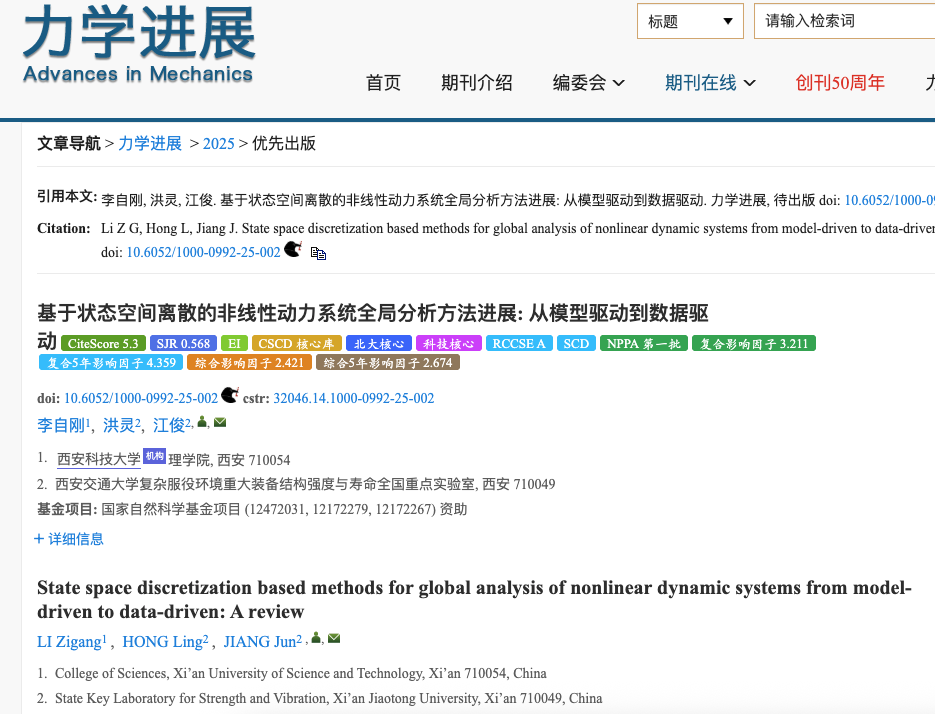 近日,best365中国官方网站李自刚教授课题组与西安交通大学江俊教授、洪灵教授合作完成的综述《基于状态空间离散的非线性动力系统全局分析方法进展: 从模型驱动到数据驱动》,在国内力学领域权威综述性学术期刊《力学进展》上在线发表。best365中国官网为第一署名单位。
