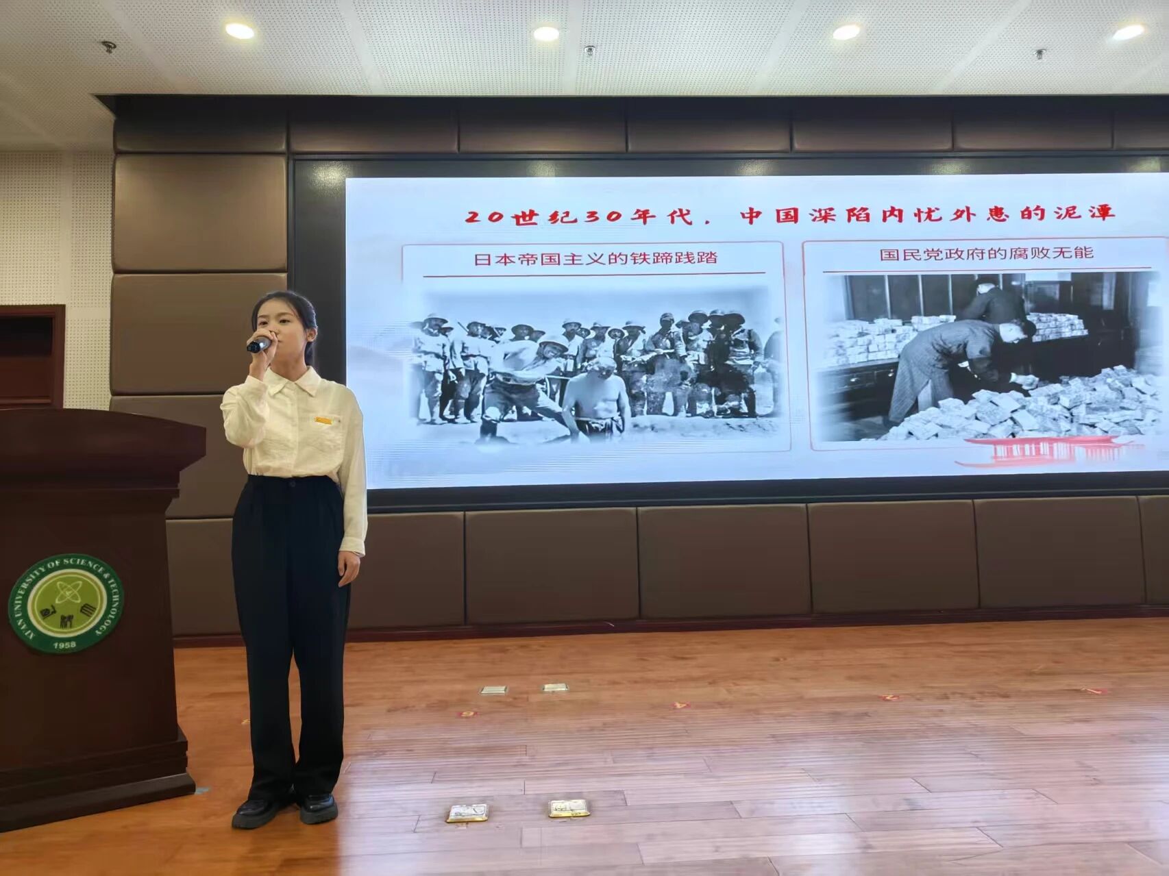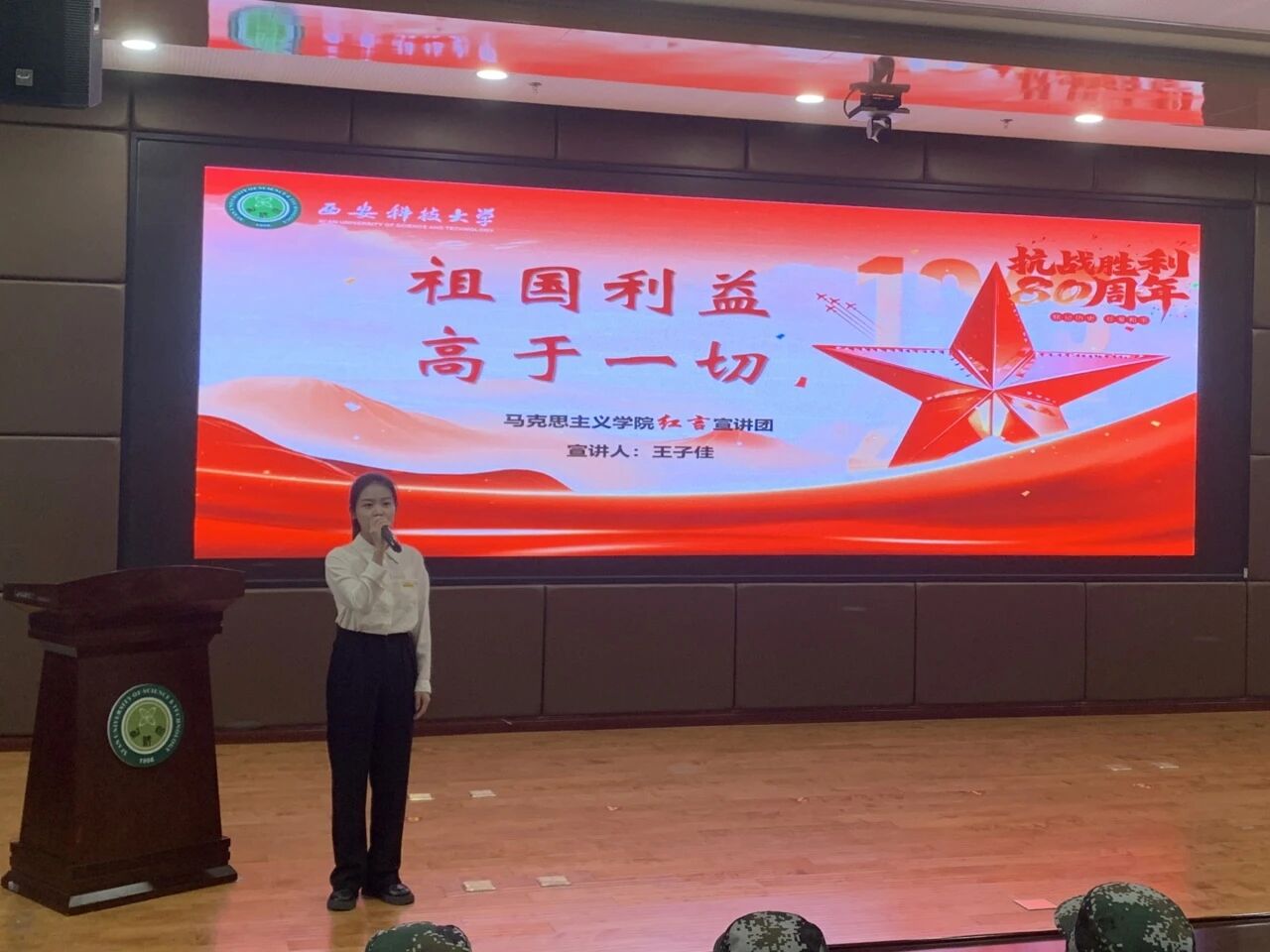 红言宣讲团成员王子佳以“祖国利益,高于一切”为题展开宣讲。她结合抗日战争时期无数先烈为捍卫国家主权与民族尊严而舍生忘死、英勇奋战的感人事迹,从历史细节切入,生动讲述了杨靖宇、赵尚志等抗日将领“宁为玉碎,不为瓦全”的坚定信念,深刻阐释了“祖国利益高于一切”不仅是抗战时期的精神旗帜,更是新时代青年应当坚守的价值准则。其深情而真挚的讲述,让同学们深切感受到先烈们对祖国的赤诚与担当,引发了强烈共鸣。