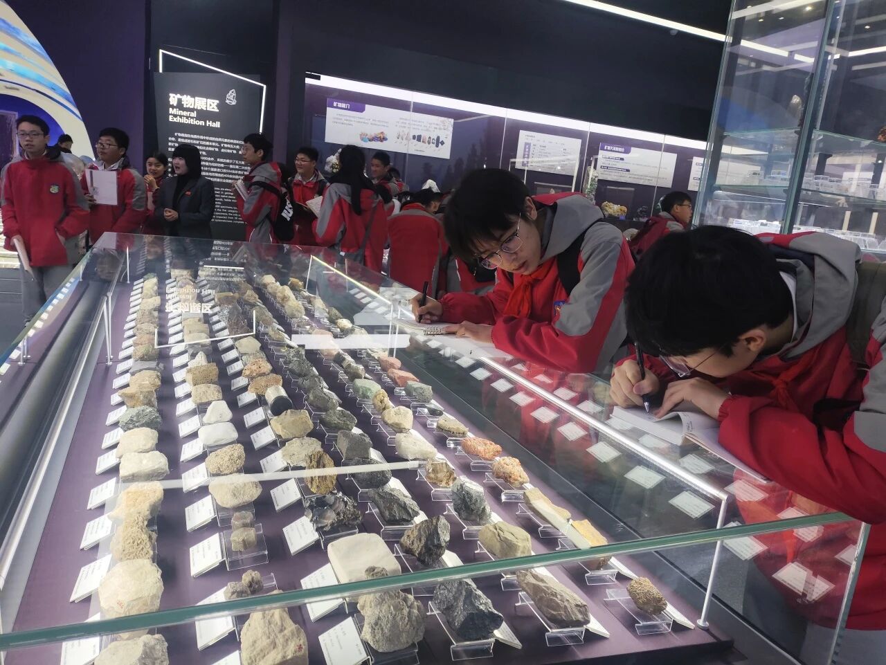 在地质博物馆的矿物标本展厅,种类繁多的展品瞬间吸引了同学们的目光。从温润如玉的玛瑙到棱角分明的石英晶体,从闪亮的黄铁矿到厚重的赤铁矿,琳琅满目。讲解员为同学们系统讲解了不同矿物的物理特性、形成条件及其在工业生产与日常生活中的重要应用,引导同学们观察与思考,领略大自然的神奇造化。