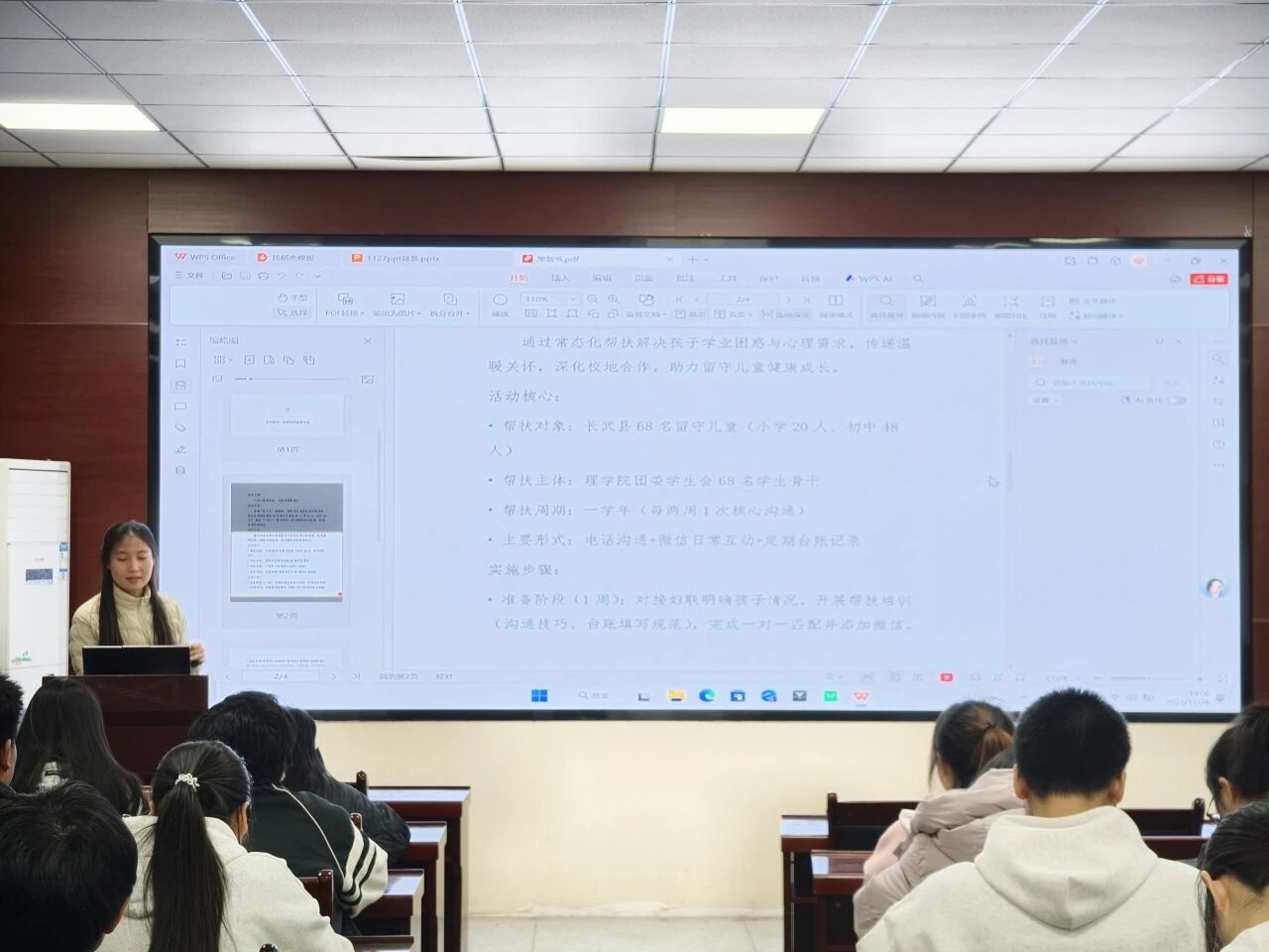 随后,杨瑞欣详细介绍了帮扶活动的具体安排与工作要求。她强调,帮扶将以电话沟通为基础,结合微信互动,每两周进行一次帮扶沟通。帮扶内容涵盖学业辅导、心理疏导、成长陪伴与安全守护等多方面。她特别提醒,帮扶过程中要注重方式方法,尊重孩子意愿,并在每次沟通后认真填写《帮扶台账》,及时记录与反馈。