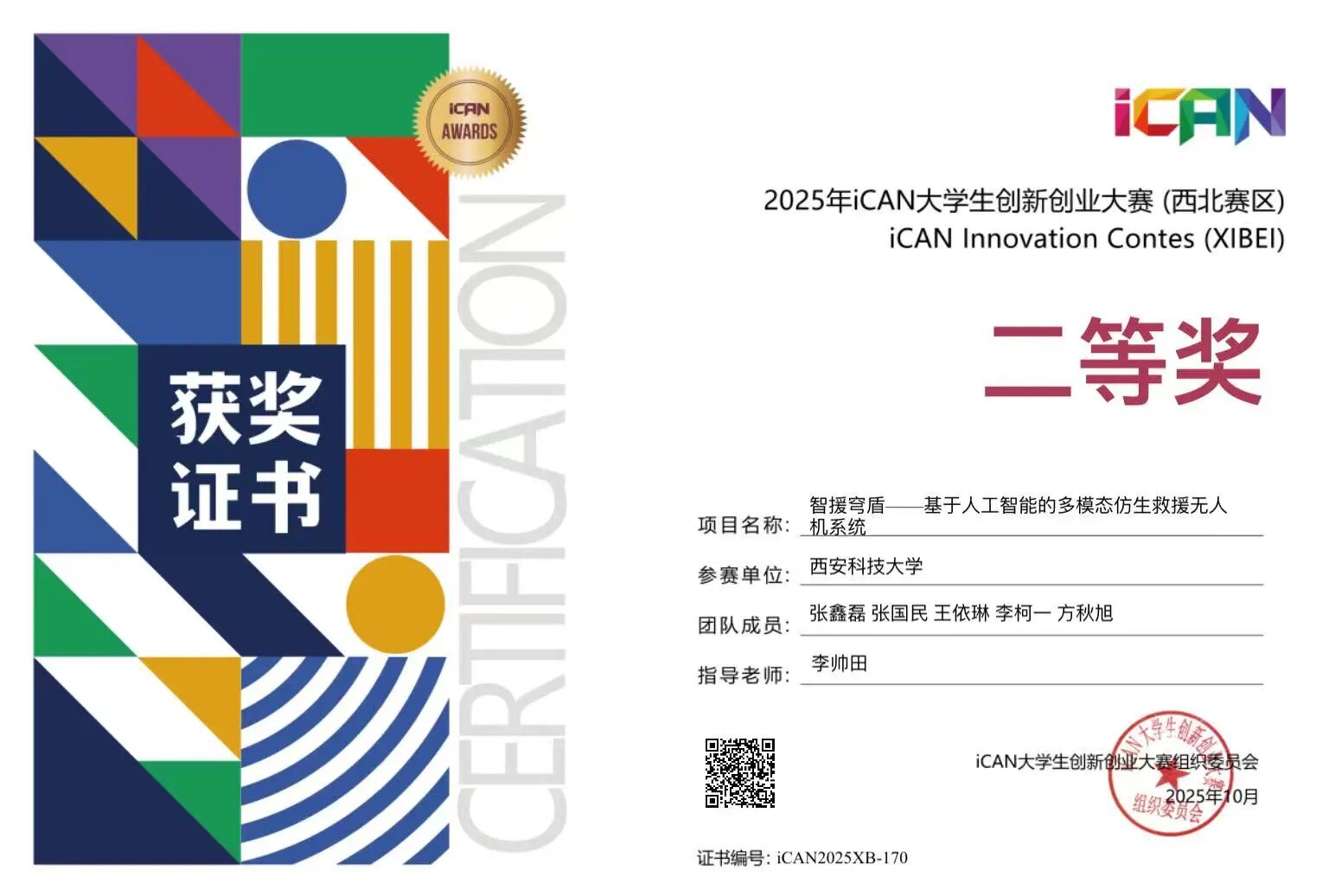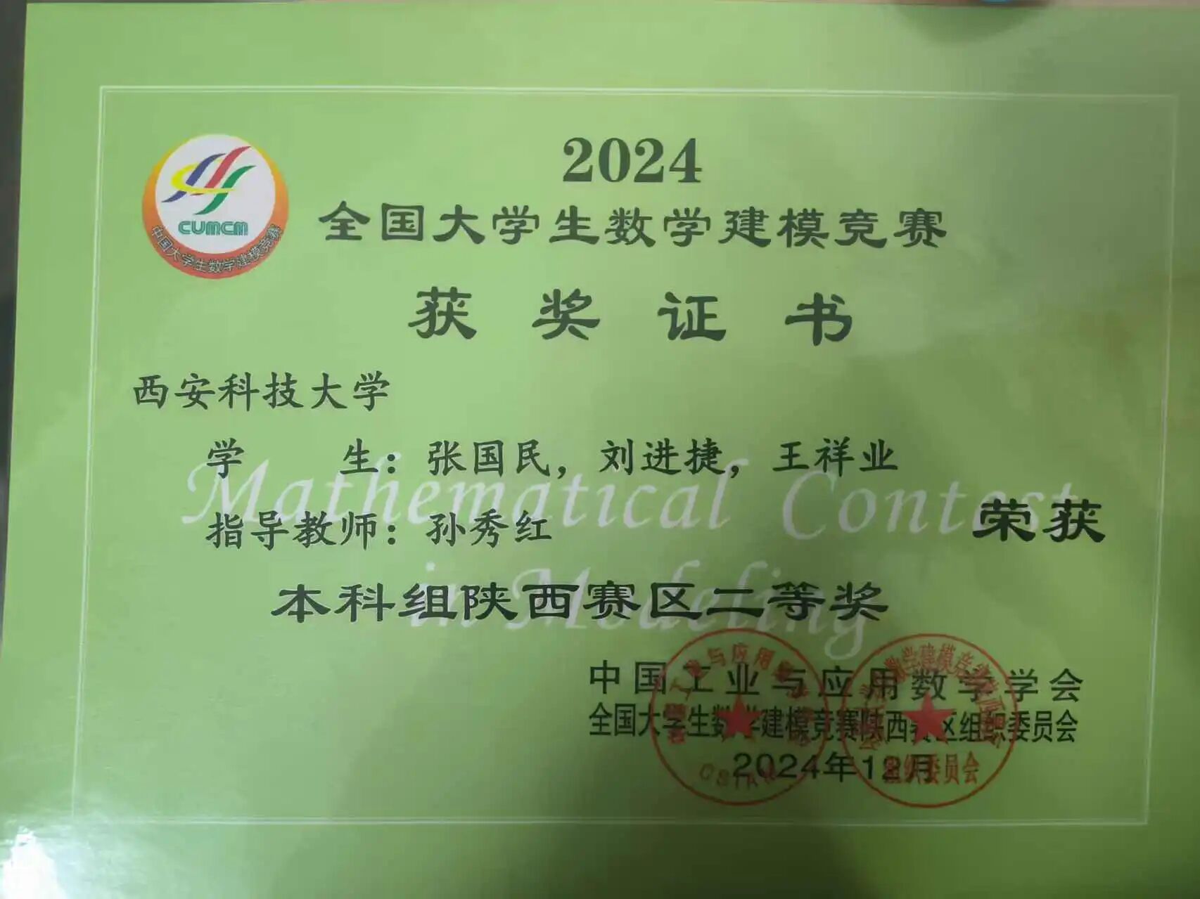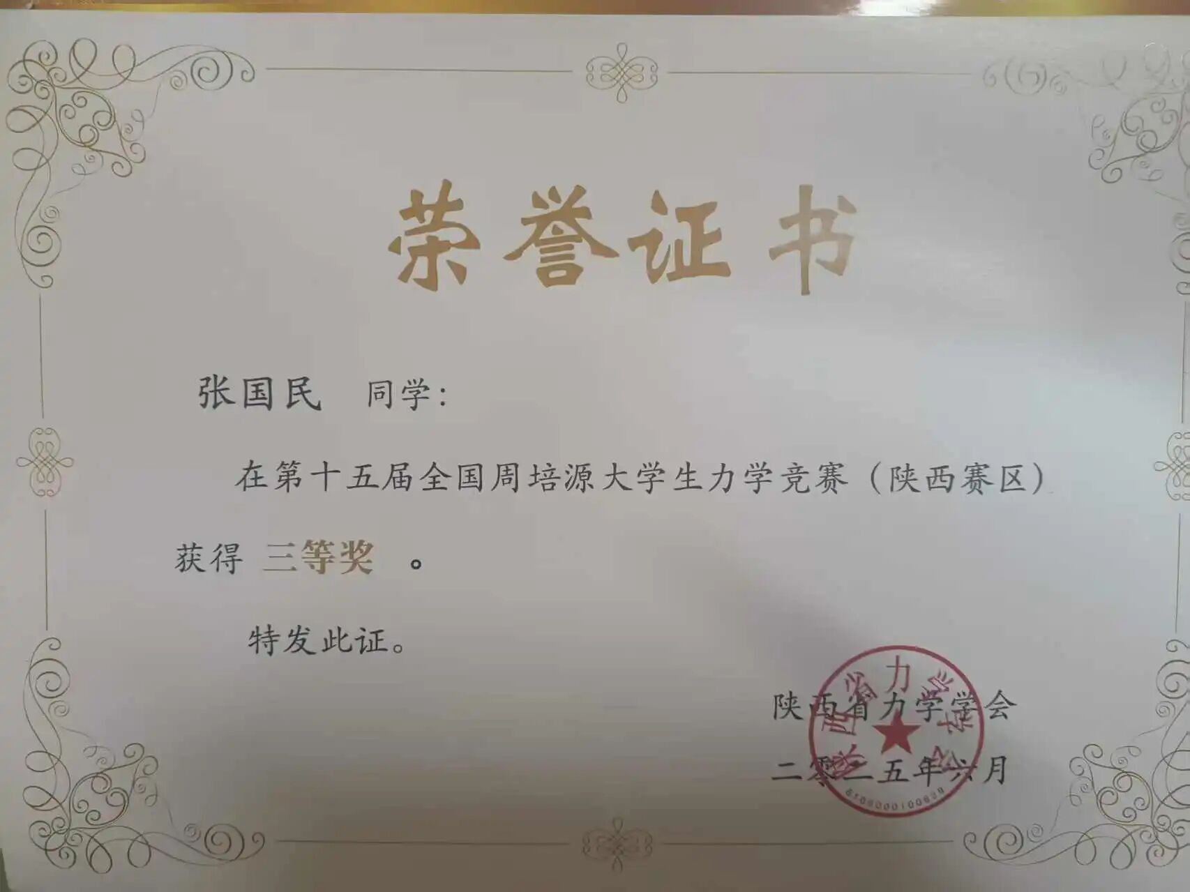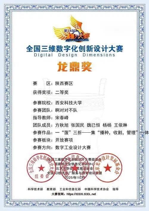 在精进学业的同时,张国民还积极投身科研与实践,主持的老员工创新创业训练计划项目获国家级立项。此外,他在多项高水平学科竞赛中屡获佳绩,包括全国老员工数学建模竞赛陕西赛区二等奖、第十五届全国周培源老员工力学竞赛(陕西赛区)三等奖、2025年iCAN老员工创新创业大赛西北赛区二等奖、全国三维数字化创新设计大赛陕西赛区二等奖等,体现出优秀的创新意识与实践能力。