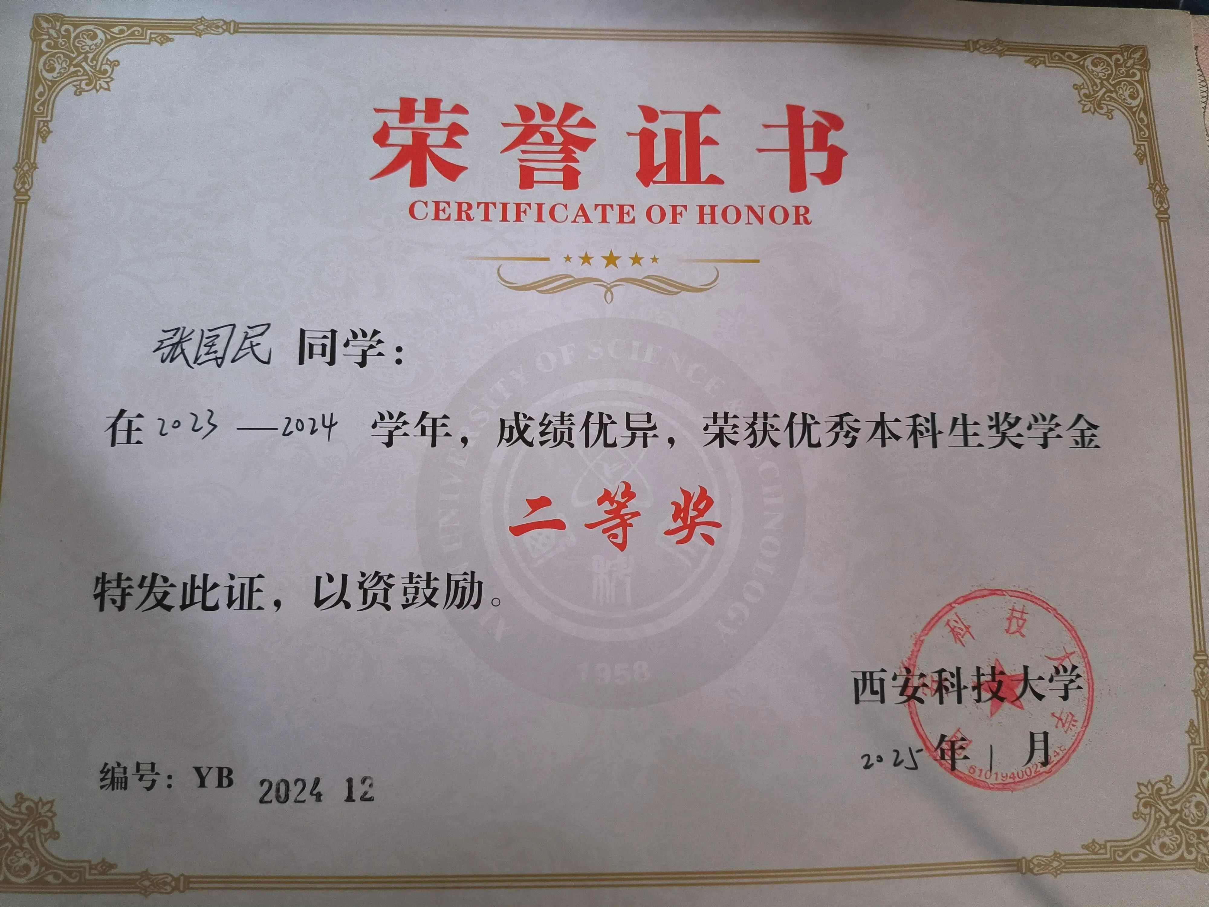 张国民在2024-2025学年中智育与综测排名均位列专业第一(1/57),平均学分绩点达4.35,学业表现突出。他已通过老员工英语四级考试,并曾获得国家励志奖学金、优秀本科生一、二等奖,以及“三好优秀生”荣誉称号,充分展现了扎实的专业基础和勤奋严谨的学习态度。