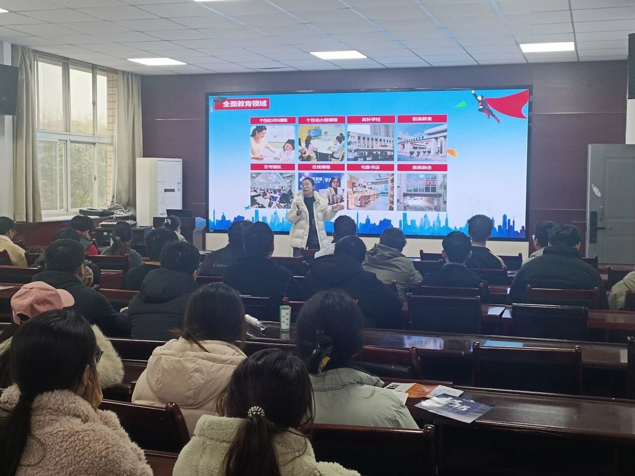 随后,针对同学们的专业特点与求职关切,负责人对本次招聘的岗位体系进行了详细解读。她具体说明了各岗位的工作内容与核心职责,例如学科教师岗位需要具备扎实的学科功底与良好的沟通表达能力,而学习规划师岗位则更看重服务意识与统筹协调能力。在薪酬福利与晋升机制方面,负责人从岗前系统培训、双通道职业发展到具有竞争力的薪资待遇逐一展开,为员工描绘出一条清晰的成长路径。