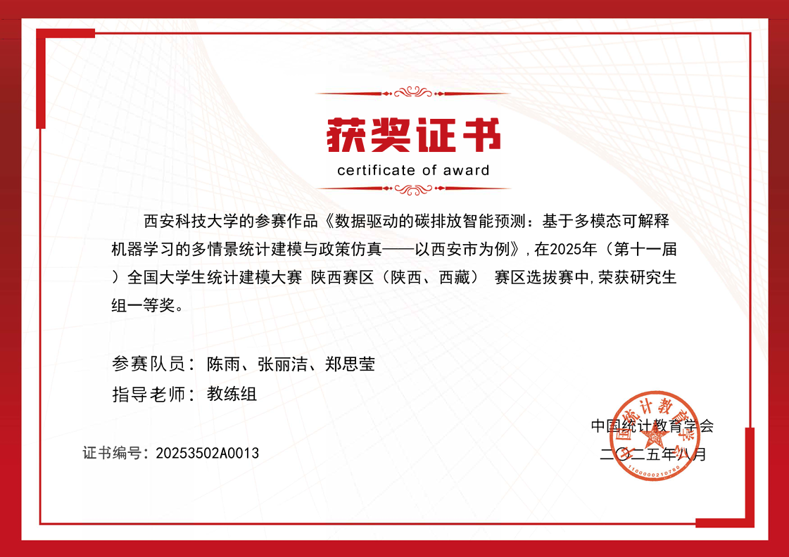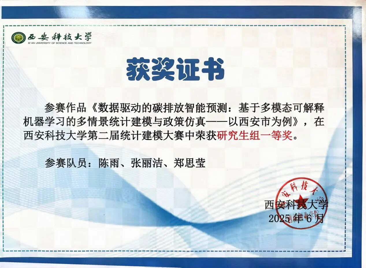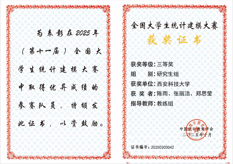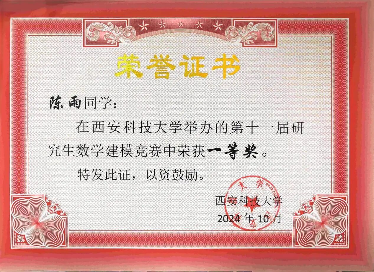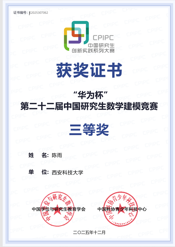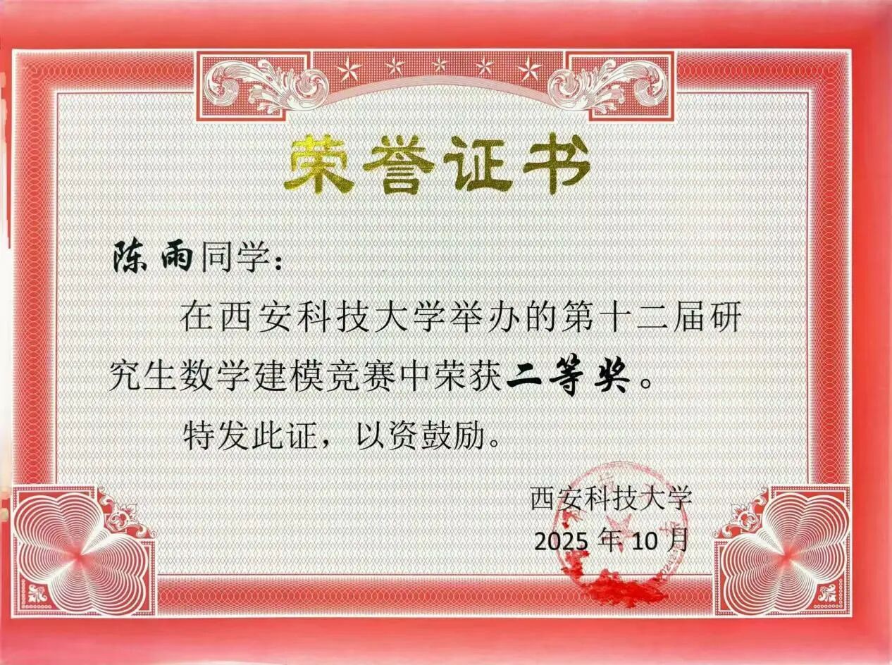 除了学术研究,陈雨也积极参加各项竞赛,并于2025年12月获“华为杯”第二十二届中国研究生数学建模三等奖;全国老员工统计建模大赛研究生组国家三等奖 (2025.10)、省一等奖 (2025.8)、校一等奖 (2025.6);best365中国官网第十一届研究生数学建模竞赛一等奖(2024.10);best365中国官网第二届统计建模大赛一等奖(2025.6);best365中国官网第十二届研究生数学建模竞赛二等奖(2025.10)。