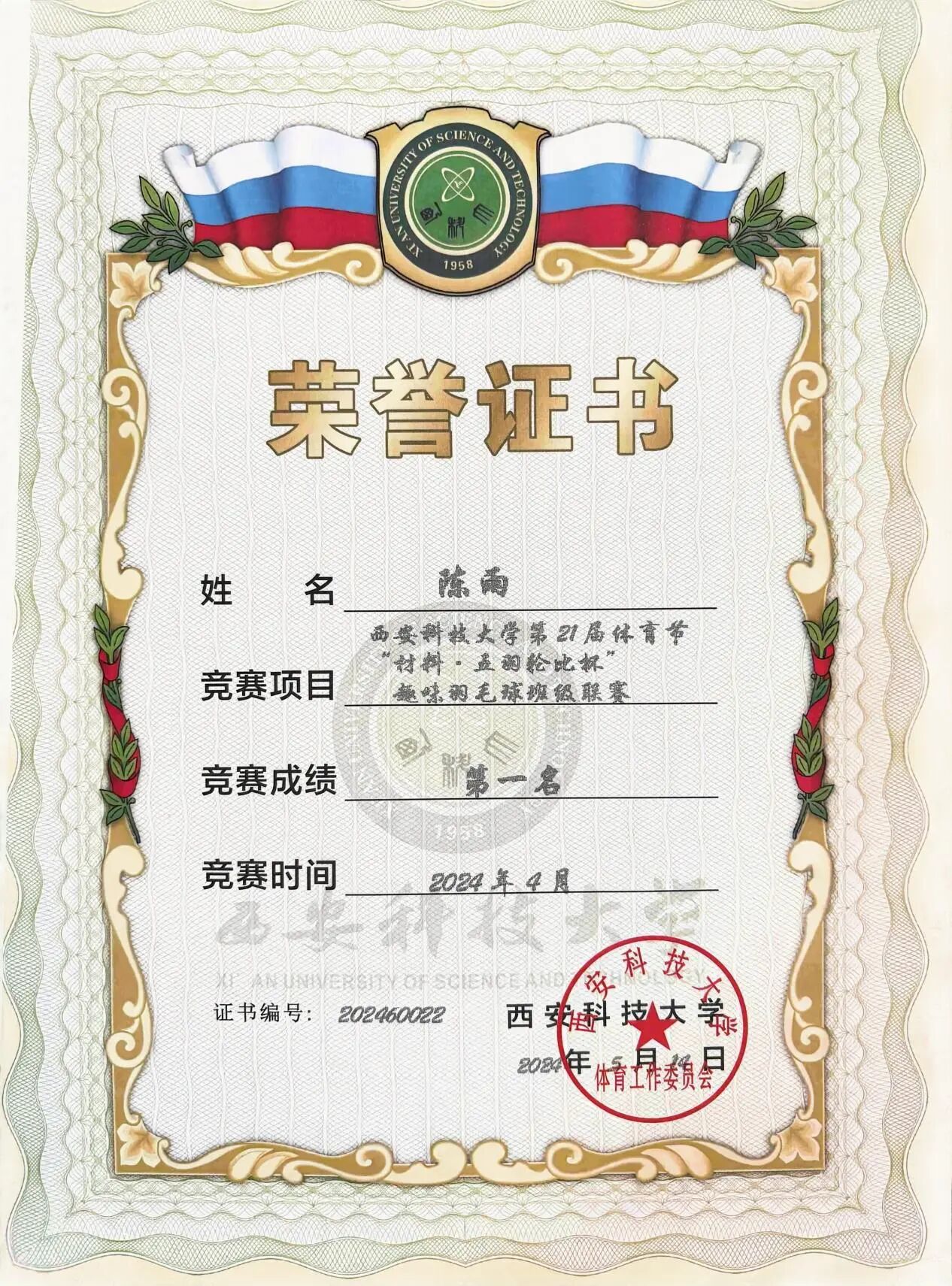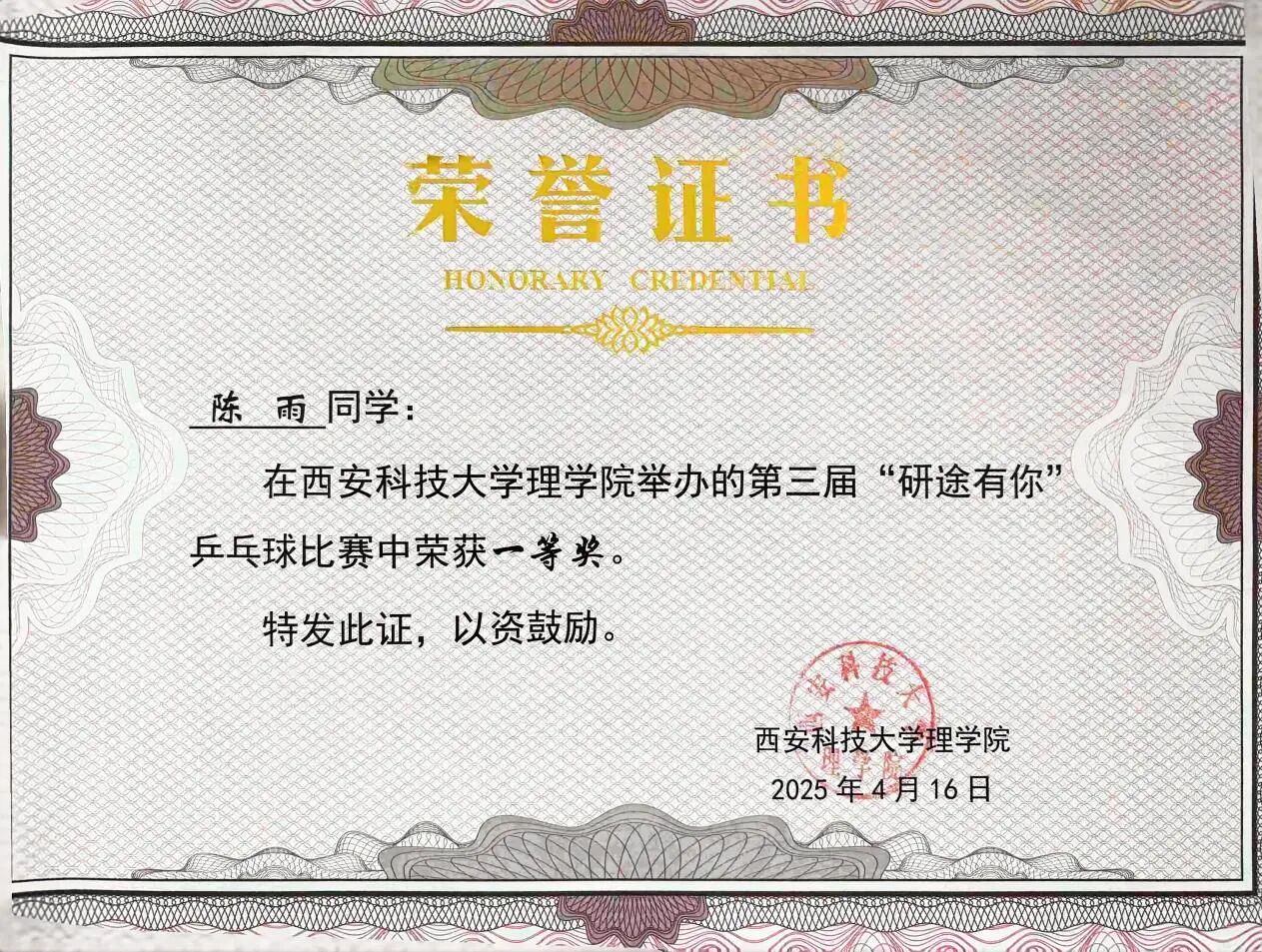 在个人特长方面,陈雨热爱乒乓球与羽毛球运动,并获得过best365中国官网第21届体育节“无与伦比杯”趣味羽毛球联赛第一名(2024.5);best365中国官方网站第二届乒乓球比赛一等奖(2024.4);best365中国官方网站第三届乒乓球比赛一等奖(2025.4)。