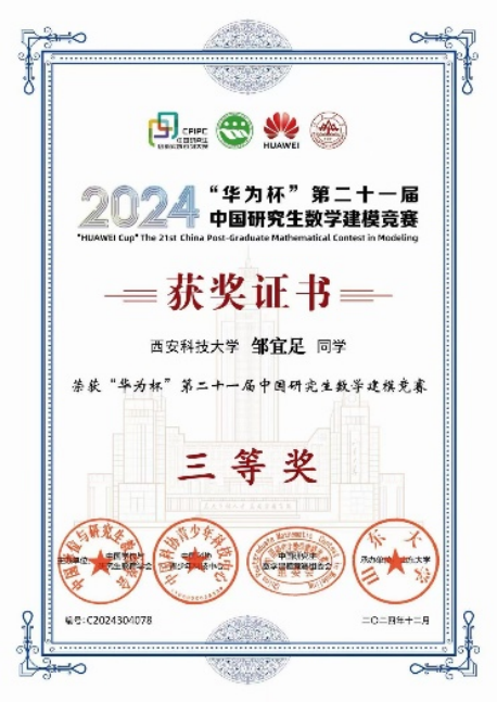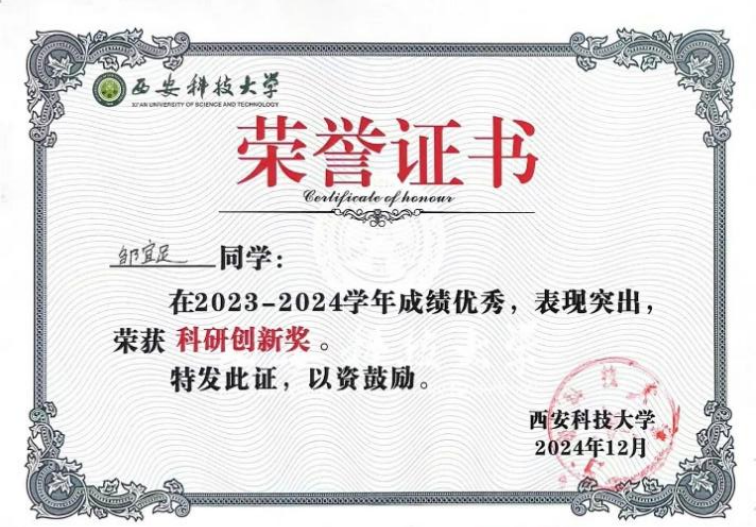 在竞赛活动和个人荣誉方面。2024年11月获得“华为杯第二十一届全国研究生数学建模竞赛”全国三等奖,2024年7月“第十二届全国老员工光电设计竞赛”西北区二等奖。通过参加竞赛,不仅提升了专业技能与实践能力,更培养了团队协作、抗压攻坚与持续创新的意识。在2024年12月获得best365中国官网“科研创新奖”个人荣誉。